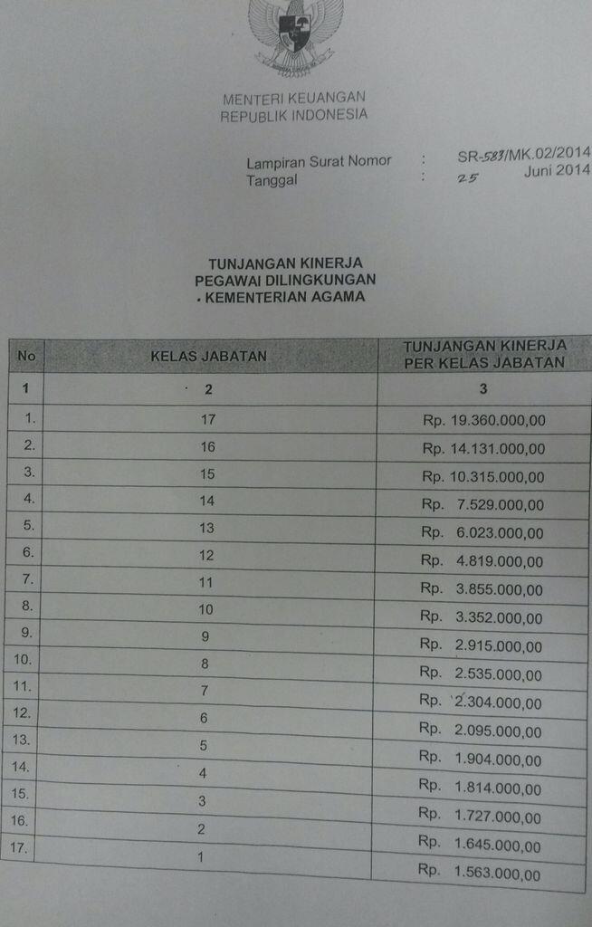 Kabar besar hati buat Anda guru dan pegawai negeri sipil di lingkungan kementerian Agama. bahwa tahun 2014 ini menteri keuangan resmi telah menetapkan tunjangan remunerasi / tunjangan kinerja di lingkungan kementerian Agama. lewat surat bernomor SR-583/MK.02/2014 tertanggal 25 Juni 2014. Surat ini merupakan persetujuan tunjangan tunjangan kinerja bagi pegawai negeri sipil di lingkungan Kementerian Agama, Kemenpora, kementerian koperasi dan UKM, Badan Pertanahan Nasional (BPN), BNPB, Setjen Komisi Yudisial, Kemenpora dan Setjen Komnas HAM.